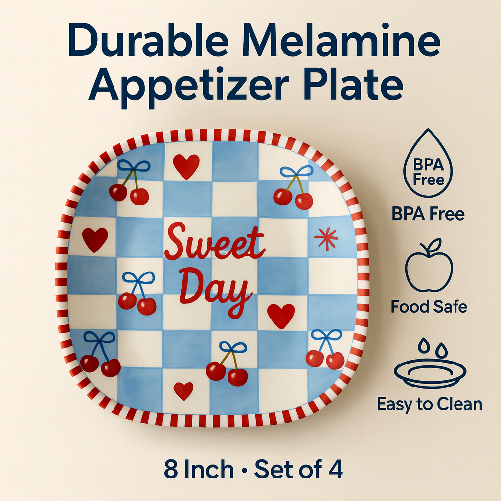 Cherry Love Checkered Party Tableware Melamine Appetizer Plate 8 Inch