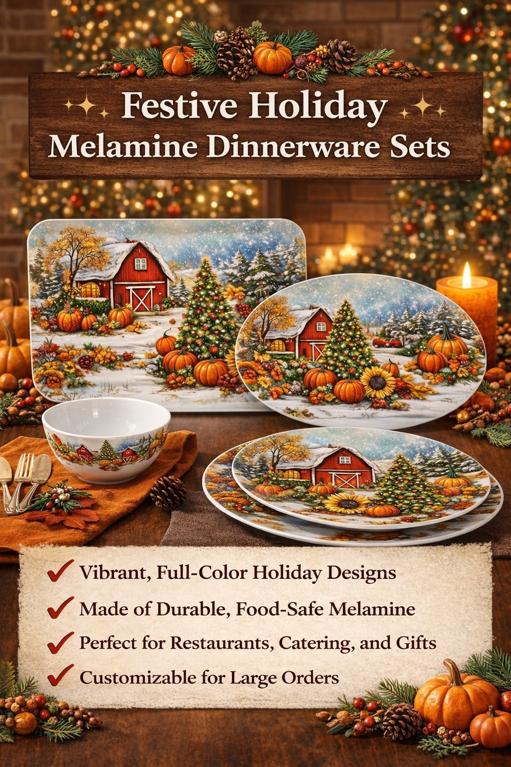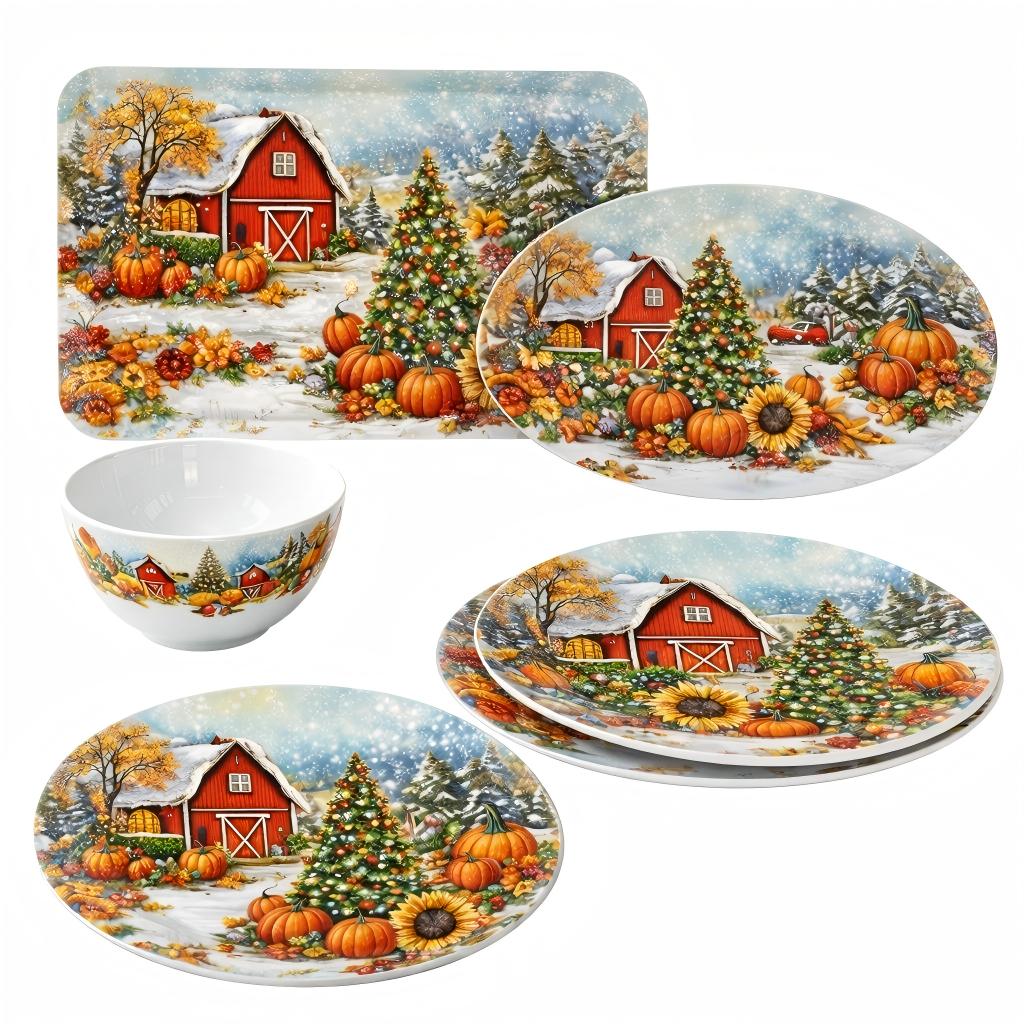 Seasonal themed dinnerware with festive decorative artwork