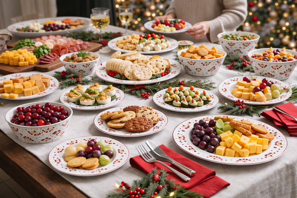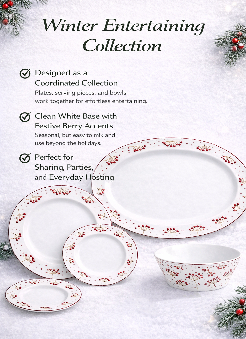 Coordinated Winter Entertaining Collection featuring plates, platters, and bowls.