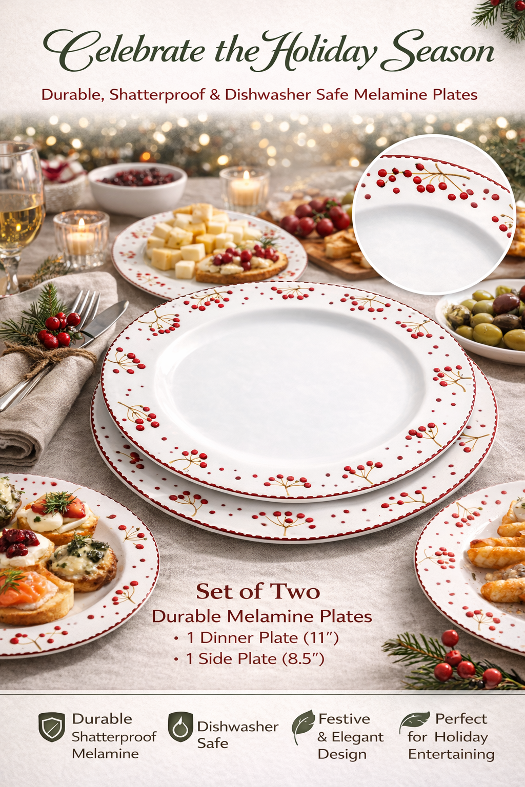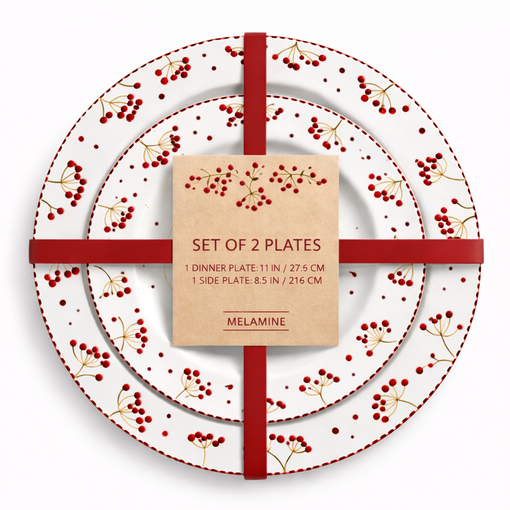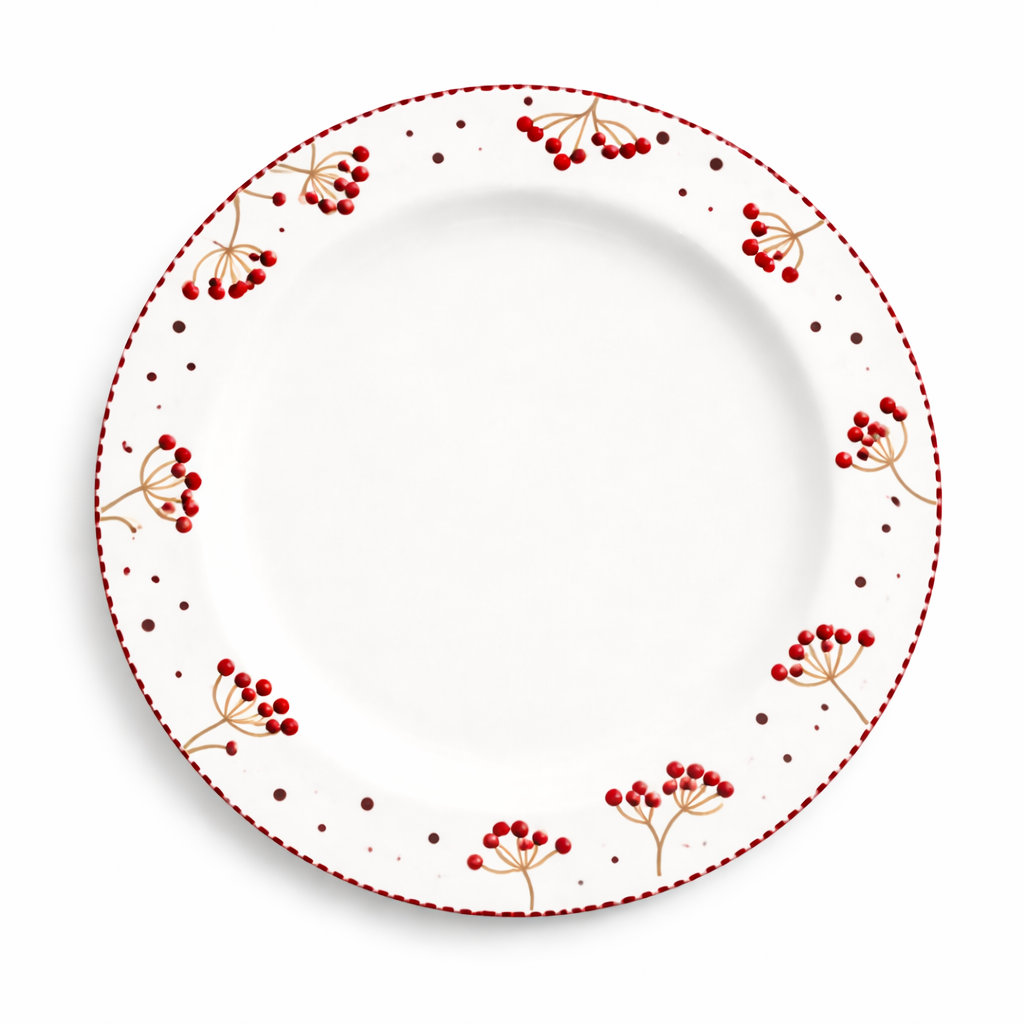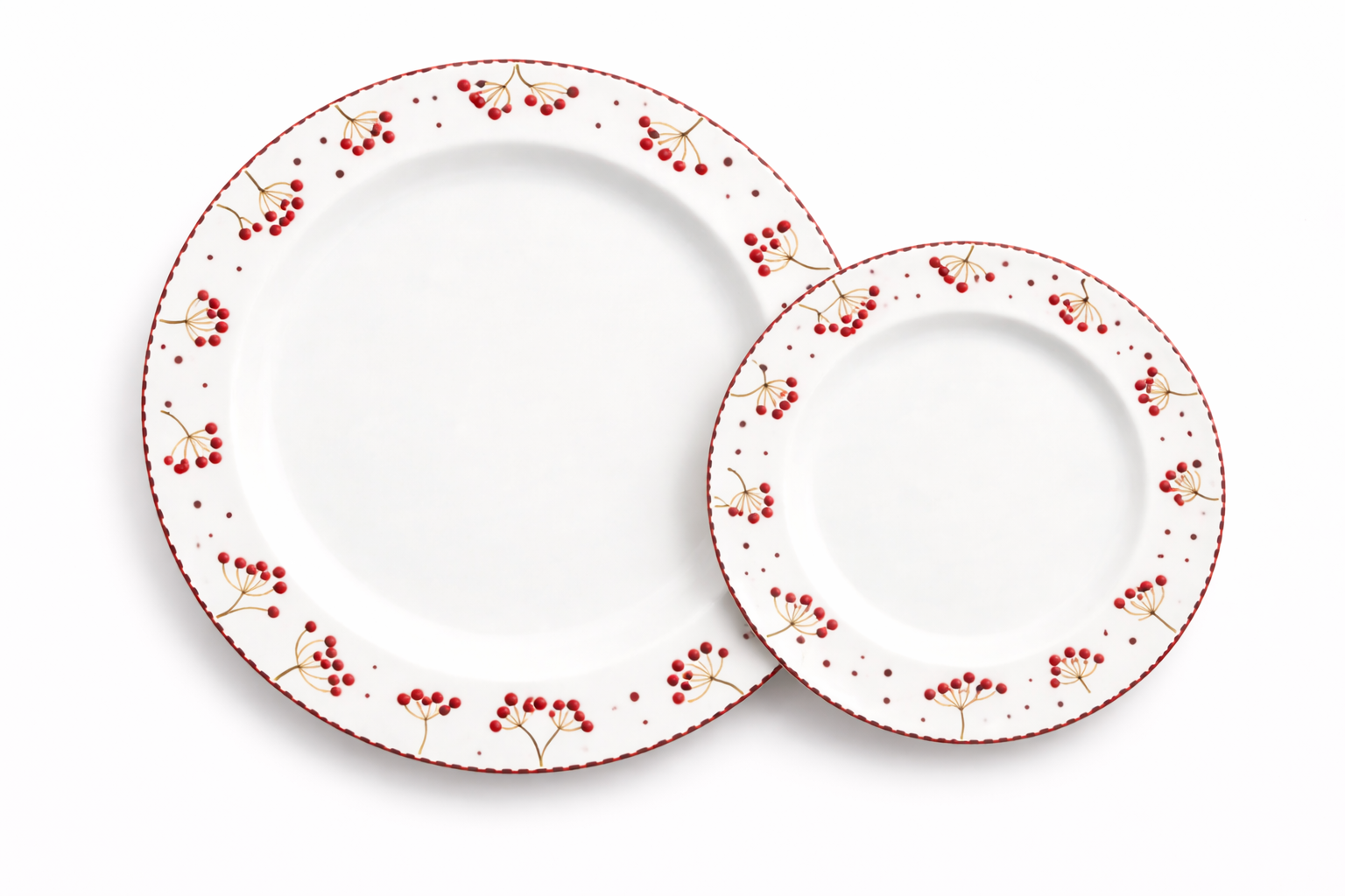 Clean white base with festive red berry accents, suitable for seasonal and everyday settings.