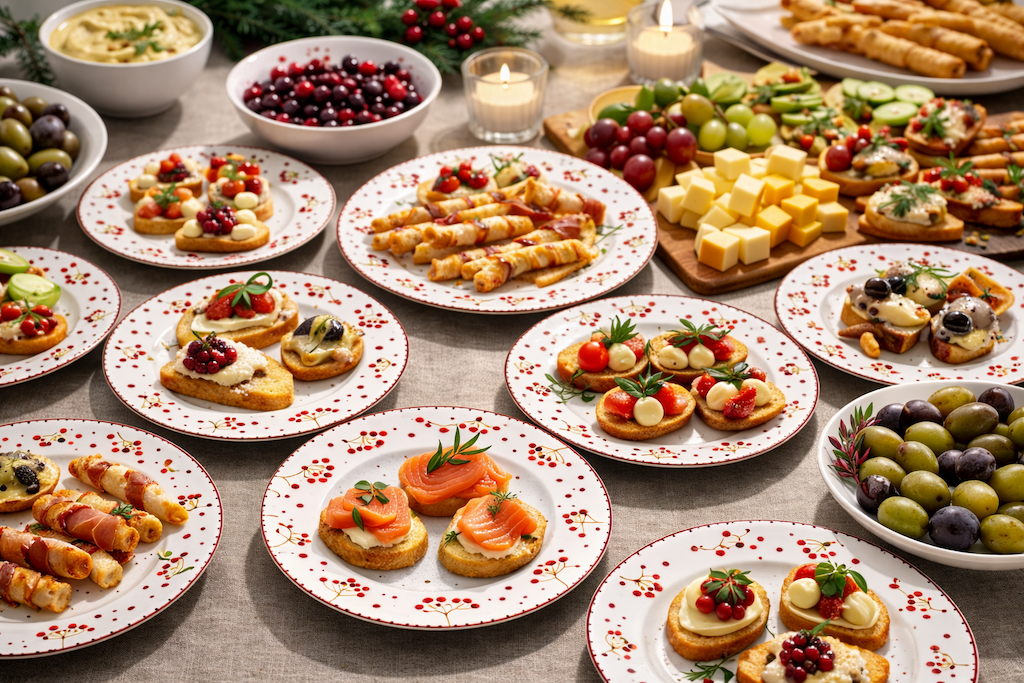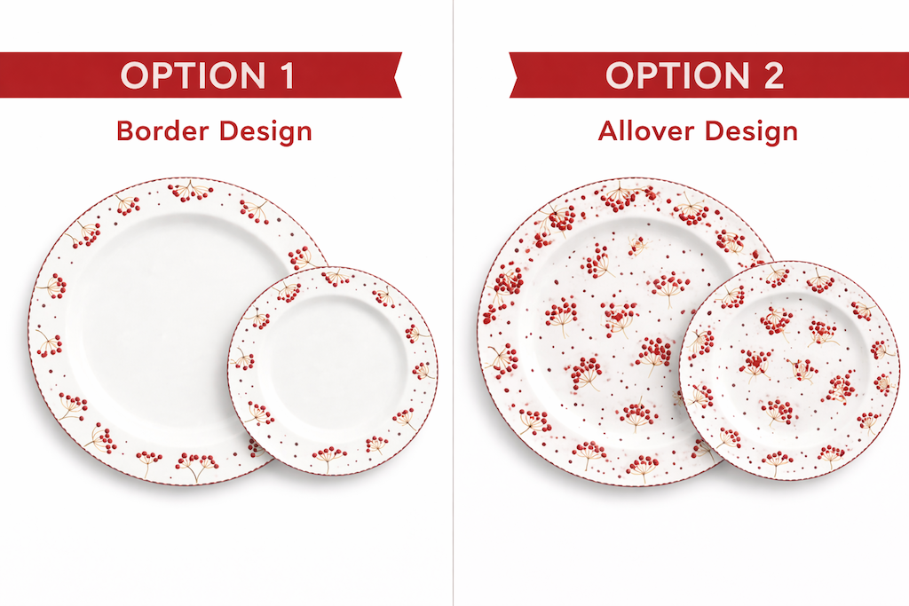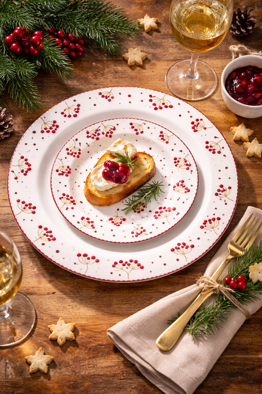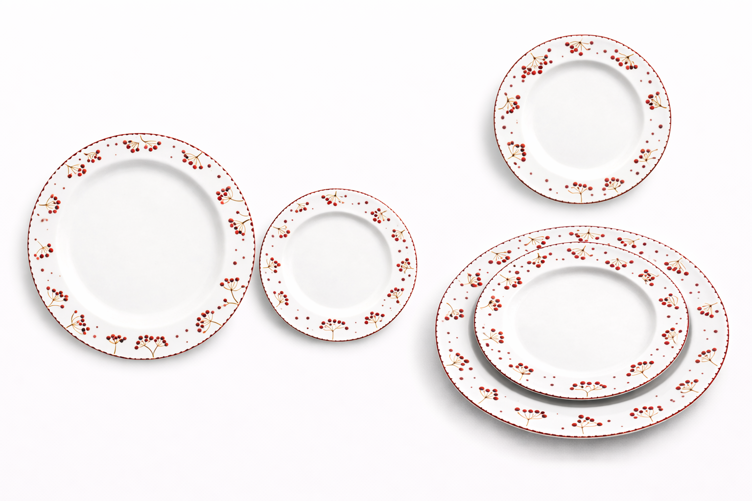 Clean white base with festive red berry accents, suitable for seasonal and everyday settings.